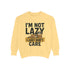 This cozy unisex garment-dyed sweatshirt embodies relaxation and nonchalance. With its playful slogan, "I'm Not Lazy, I Just Don't Care," it invites you to embrace a laid-back attitude. Crafted from a soft blend of 80% cotton and 20% polyester, this sweatshirt is your go-to for both comfort and style. Its relaxed fit makes it perfect for casual hangouts, lounging at home, or running errands. Ideal for anyone seeking a balance of comfort and humor, it's a wonderful gift for friends or family who appreciate witty fashion. This sweatshirt is also great for casual gatherings, holidays, and moments when you just want to be yourself.